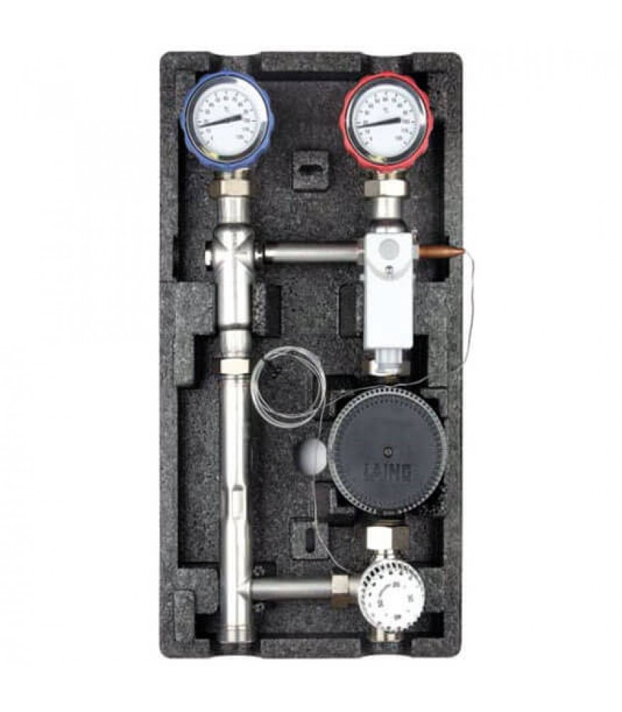 2 шаровых крана DN25 со встроенными в рукоятку термометрами; обратный клапан (обозначены стрелками); в насосных группах FW-0 без насоса установлен распорный элемент 130 мм или 180 мм — 1″; трёхходовой смеситель DN20; термостатическая головка (20 — 50°C); сторож макс. температуры (20 -60°C).